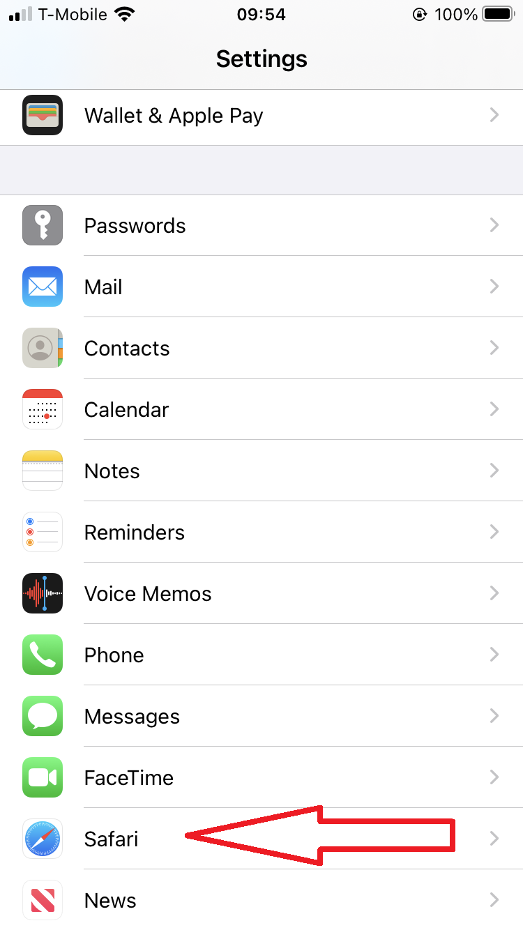 El primer paso es abrir los ajustes de iOS, y buscar la opción **Safari** dentro del listado de aplicaciones: